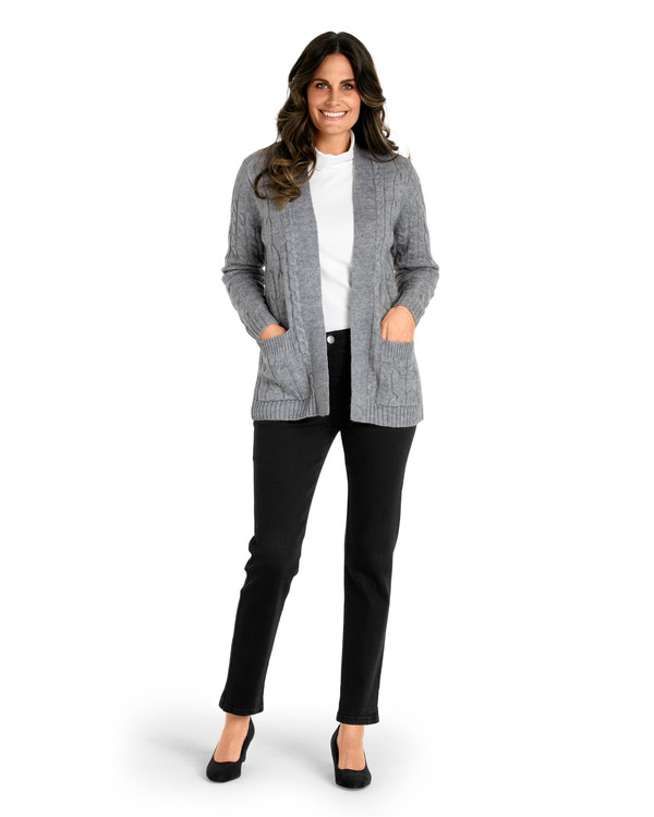 Kabelstickad kofta med fickor. Längden följer storleken ca 72-80 cm från axeln. 80% akryl, 20% nylon. Fintvätt 30°. Färg gråmelerad.