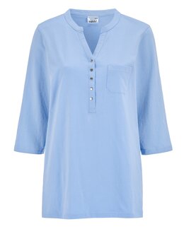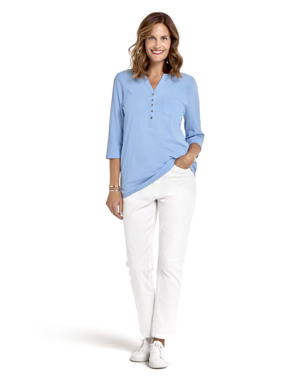 En följsam och bekväm tunika. Rund hals och en kort knappslå fram som ger en stilfull detalj. Med 3/4-ärmar och en praktisk bröstficka blir detta ett mångsidigt plagg som passar lika bra till vardag som till lite finare tillfällen. Längden följer storleken ca 75-83 cm från axeln. 100% bomull. Fintvätt 40°.