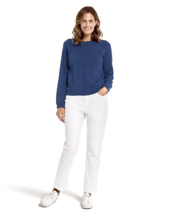 En härlig jumper i mjukt finstickat material med vackert kabelmönster fram som ger tidlös elegans. Rund halsringning skapar en smickrande silhuett, och muddar i ärmslut och nederkant ger en snygg och bekväm passform. Längden följer storleken ca 60-68 cm från axeln. 100% bomull. Fintvätt 40°.