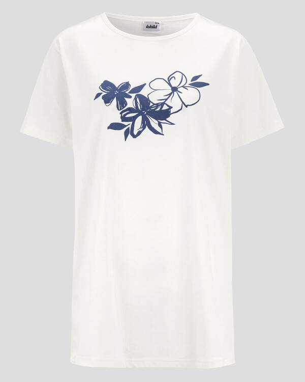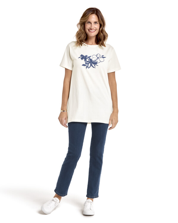 En bekväm tunika i mjukt trikåmaterial med vackert tryckt blommönster fram. Den följsamma passformen ger skön rörelsefrihet, och den fina slit-detaljen i sidan ger komfort. Längden följer storleken ca 80-88 cm från axeln. 100% bomull. Fintvätt 40°.
