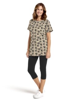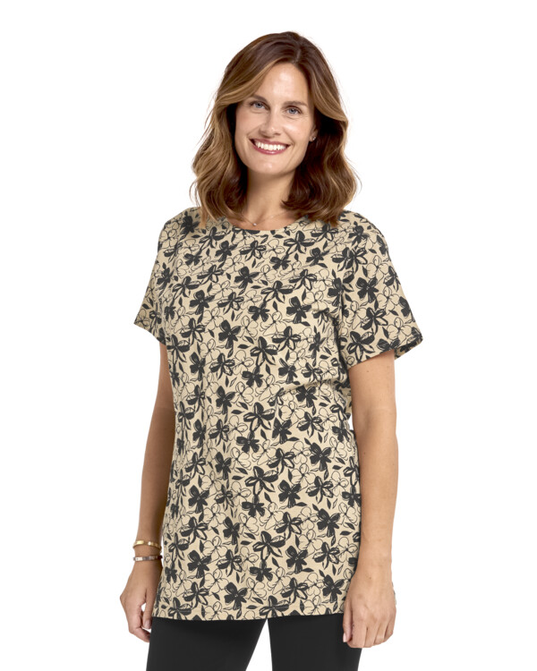 En följsam och bekväm tunika i mjuk trikå med ett vackert blommönster som ger en feminin och harmonisk känsla. Den stilfulla designen kompletteras av en praktisk slits i sidan för ökad rörelsefrihet. Ett mångsidigt plagg som passar lika bra till vardags som vid särskilda tillfällen. Längden följer storleken ca 80-88 cm från axeln. 95% bomull, 5% elastan. Fintvätt 40°.