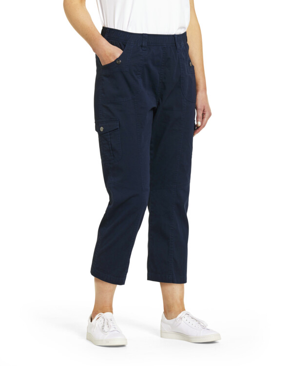 Bekväm byxa i mjuk bomullsstretch med resår i midjan för skön passform. Fickor fram med dekorativ knapp och hällor i linningen. Ok och prydnadsficka bak som ger ett fint intryck.
