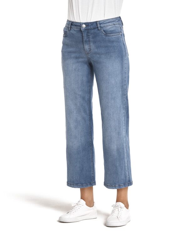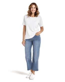 Denna mjuka och stretchiga ankelbyxa kombinerar komfort med stil i en klassisk 5-ficksmodell. Dekorativa sömmar pryder både bakfickorna och insidan av benen, vilket ger byxan en genomarbetad look. Modellen har en normalhög midja och en linning med hällor, perfekt för att bära med bälte. De raka benen har en generös vidd som ger en avslappnad silhuett, och byxan stängs med dragkedjegylf. Innerbenslängden är cirka 65 cm i alla storlekar. 98% bomull, 2% elastan. Fintvätt 40°.