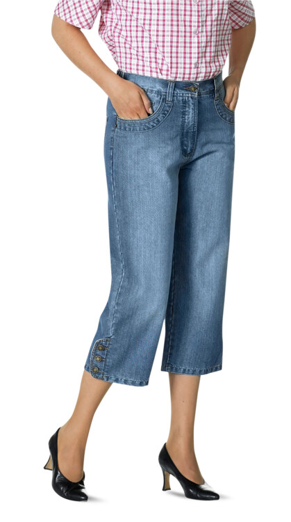 Capribyxa i jeansmodell med resår i linning. Knapp och dragkedja. Fickor fram och bak. Dekorativ knäppning vid benslut. ...