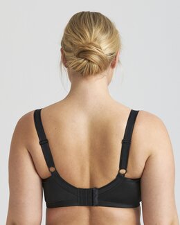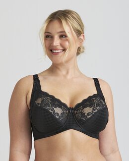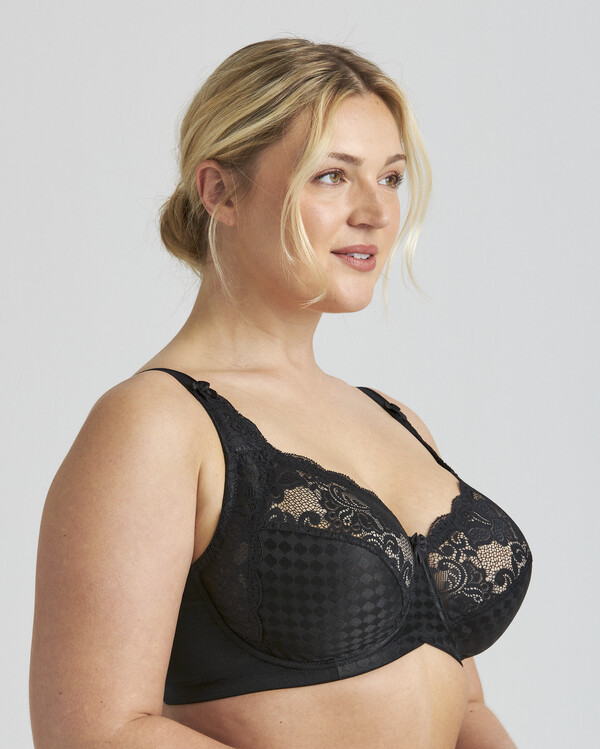 Elegant bygel-bh i stretchspets – perfekt för festliga tillfällen och när du vill känna dig lite extra uppklädd. Underkuporna i stum, rutmönstrad charmeuse ger både stadga och en rund, fin form. Även sidopartierna i spets är fodrade med stumt tyg som lyfter och ger pålitligt stöd. Den smarta Ergo Front™-designen med upphöjd nederkant framtill ökar komforten, särskilt när du sitter ner. Reglerbara stretchaxelband avlastar axlarna och ger en behaglig känsla hela dagen. Behån har en elastisk, u-formad rygg med klassisk hak- och hyskknäppning. 60% polyamid, 28% polyester, 12% elastan. Rekommenderad handtvätt.