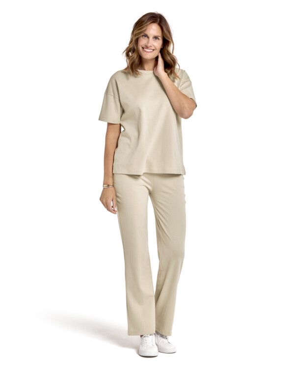 Härligt och bekvämt set i mjuk bomullskvalitet. Kortärmad överdel med längd ca 65–73 cm beroende på storlek. Byxa med resår i midjan och något vidare ben. Benlängd från midja till nederkant ca 102–104 cm beroende på storlek.
