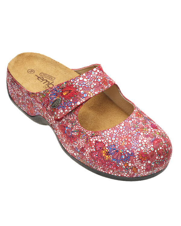 Embla Ergoflex är en bekväm och stilfull toffel i fint blommigt skinn med justerbar vristrem som ger en perfekt passform. Fotbädden är mjukt sviktande och har ett mycket bra stöd för hålfoten samt en pelott som avlastar och lyfter förfotsvalvet.